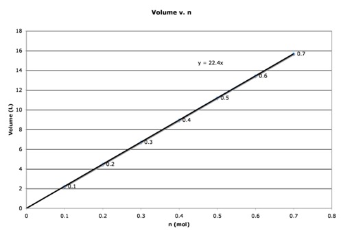 Increasing the number of moles of gas will increase the volume. In fact, if you double the number of moles, the volume will double. You can plot this on a graph of Volume (on Y) versus “n” (number of moles, on X), you get a straight line. This is a simple process. Put in some air, measure the volume. Then put in more, measure the new volume. You then plot the volume (in liters) at each number of moles. The slope of that line is in units of L/mol and is a proportionality constant relating volume to moles. The equation is V = k(n), where k is the slope of the line. A plot is included below. The number (22.4L/mol) is what the slope of the line would be for a gas at 1.00 atmosphere of pressure and 273K. You may note from that statement that we would have a different slope if we did the same experiment at a different temperature or pressure. This equation works only if temperature and pressure are constant. At other temperatures or pressures, you would have different equations.