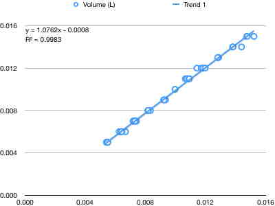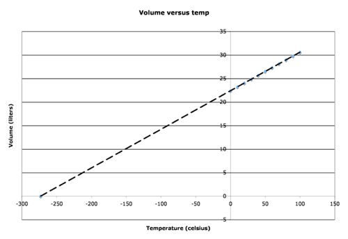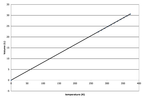 You may notice that there is a point at which the volume is predicted to go to zero. We really don’t expect that to happen, of course. Sooner or later, we would expect that the gas would condense and become a liquid, or even a solid, at which point the volume would not decrease much more. However, that point at which the volume is predicted to go to zero is -273.15 C, which we define as “absolute zero, or 0.0 Kelvin (0.0 K). If we re-plot the same data using the Kelvin scale (just add 273 to degrees celsius), we get the following plot: